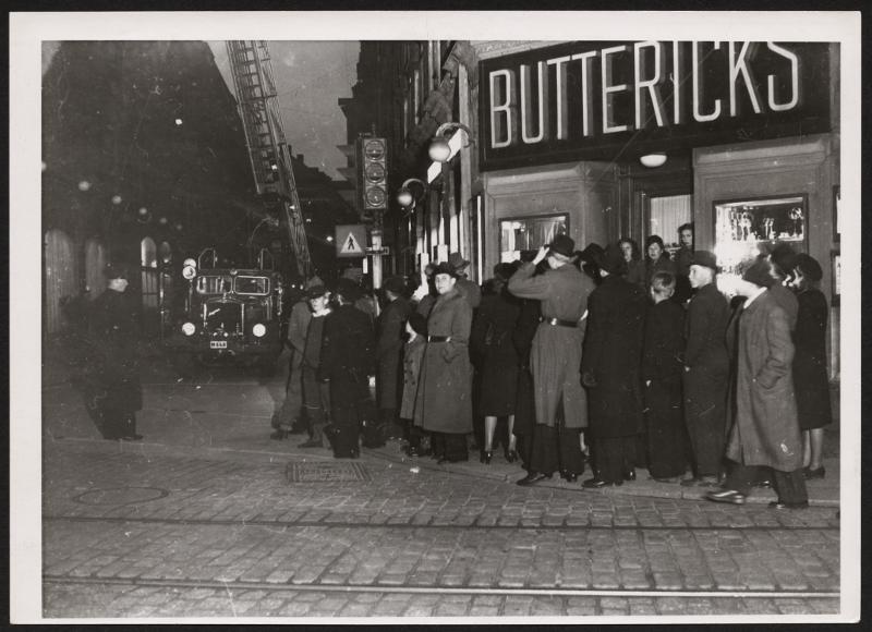 Åskådare vid Butterikshörnan , brandbil med upphissad stege på kvällen eller natten