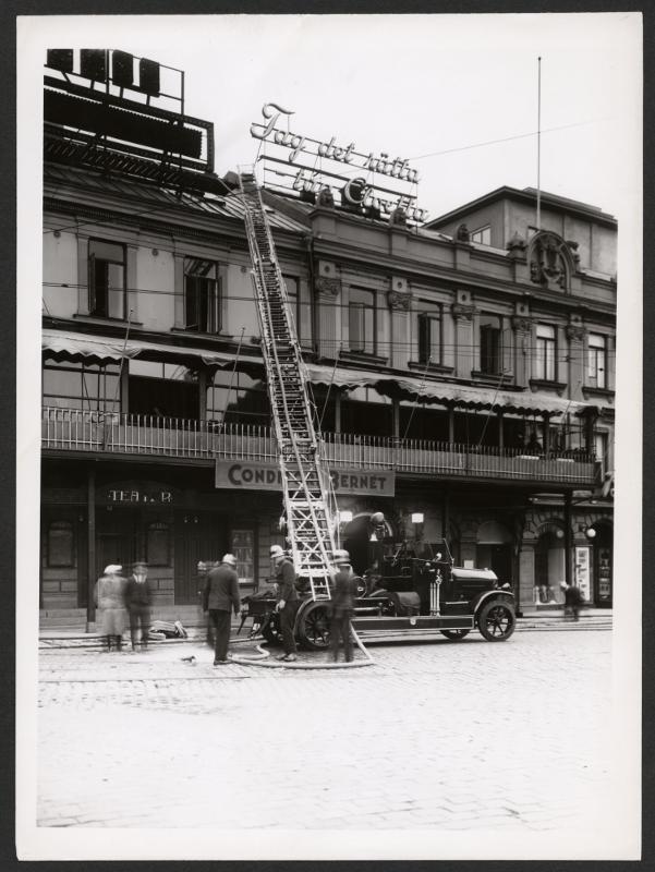 " Stora Teatern brinner. Eldhärden i Stadt Hamburgs kök." Den 1.6 1938
