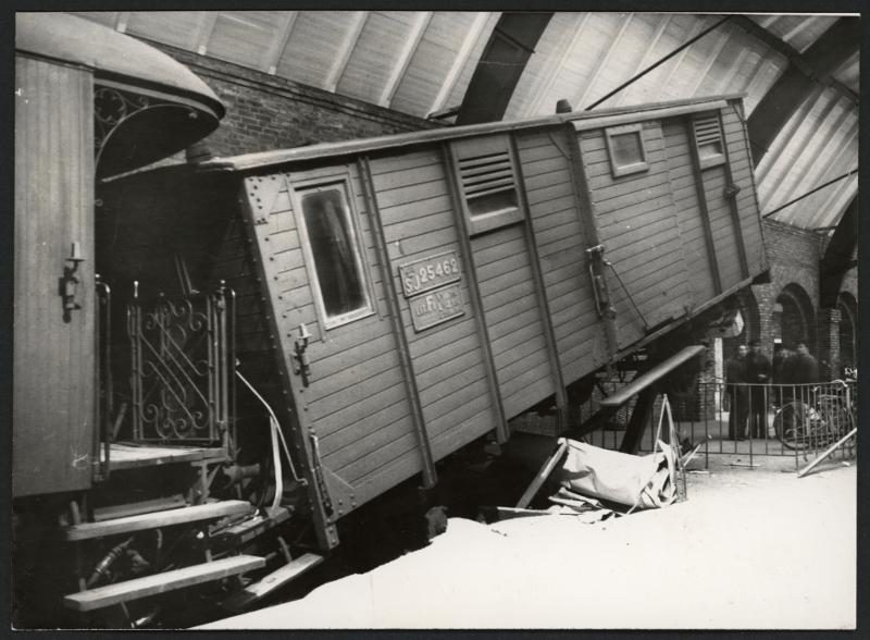 Olycka på Malmö C - en godsvagn hänger över stoppbommen i hallen.