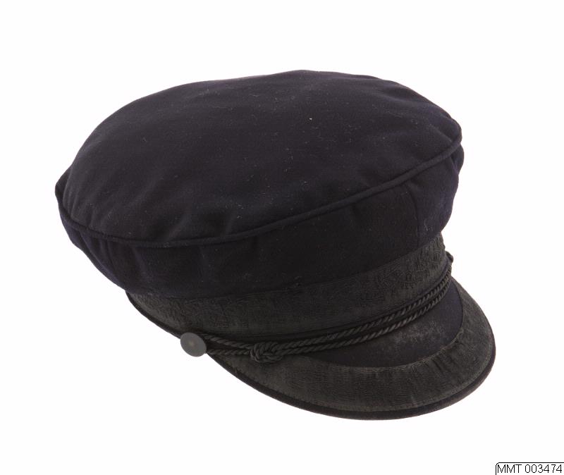 Vegamössa av svart ylletyg. Modell med hög kulle med passpoalerad kant och svart skärm av papp(?) klädd med tyget. Garnering med svart "hattband" runt kullen och på skärmen, mönstrat med löv/ kvistar. Över skärmen en svart dubbel snodd med knutor vid sidorna och fastsatt här med 2 runda små svarta knappar, med mönster av ett ankare mot räfflad botten. Foder av svart bomullstyg. Svettrem av brunt läder.