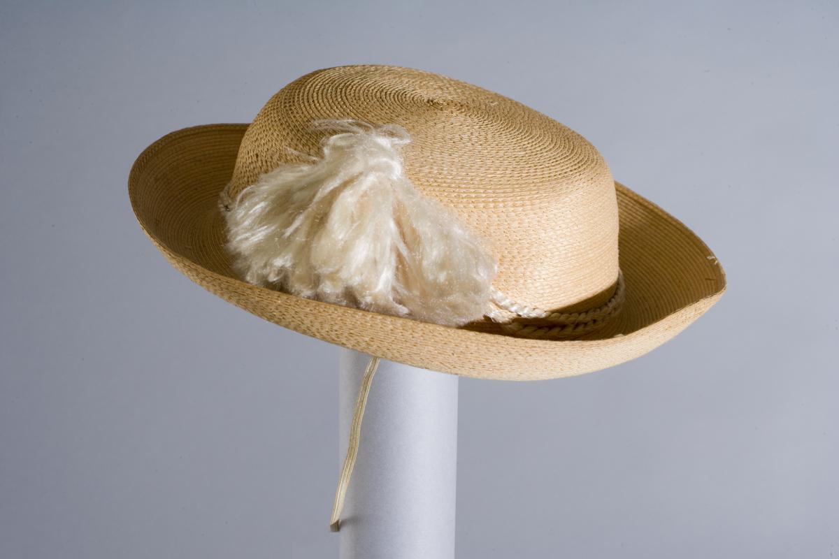 - Stråhatt, halmhatt, för barn. Platt kulle, uppvikt brätte. Runt kullen är två varv av ett grovt silkessnöre virat, vid ena sidan en stor, vit silkestofs. Fodrad med gles, vit linneväv. Stort tryck på papper under fodret med texten: SELF ADJUSTING. Gummiband som hakrem.