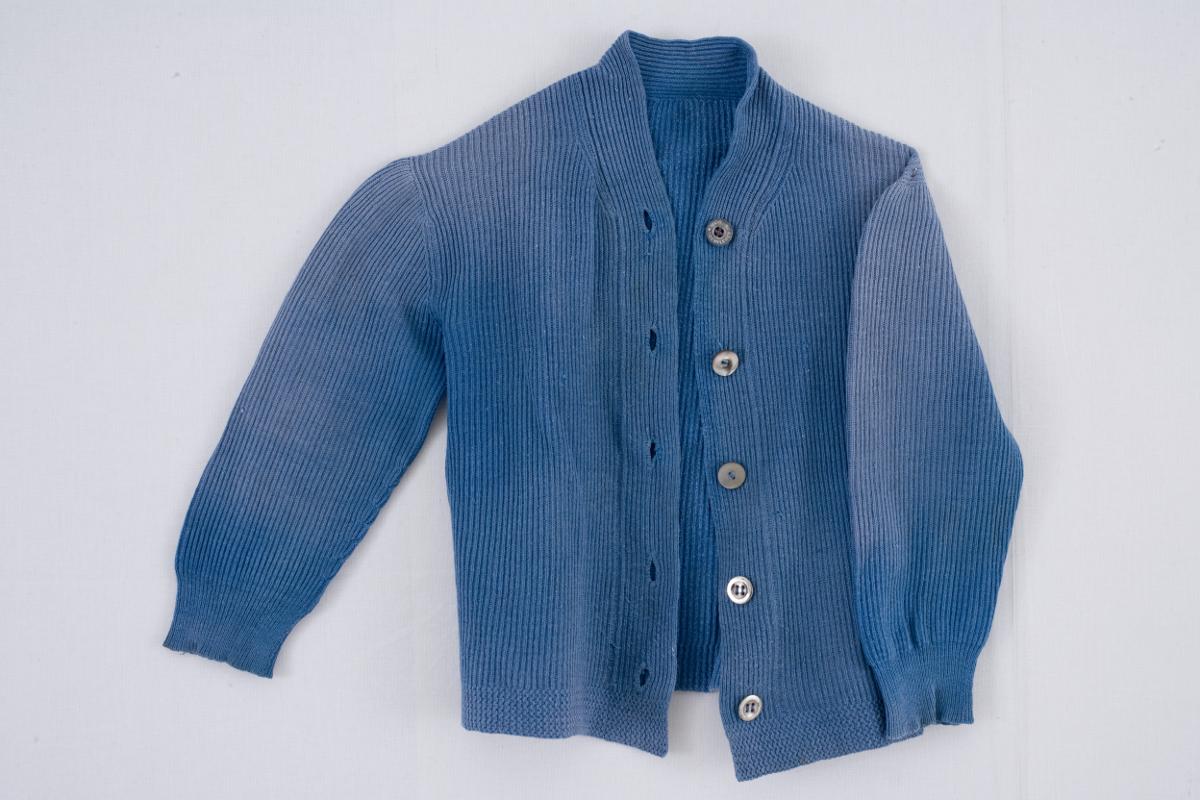 Kofta av blått bomullsgarn. Knäpps fram med tre vitmetall- och två grå pärlemorknappar. V-ringad, långa ärmar. Maskinstickad, patentstickning.