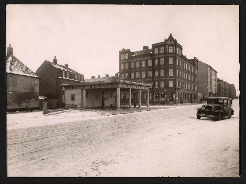 - Gatubild, Shell bensinmack, Bil M14518. Dåvarande Fredsgatan och Gropgatan.
