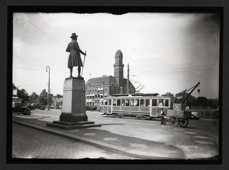 Norra Vallgatan, Frans Suells staty, spårvagn