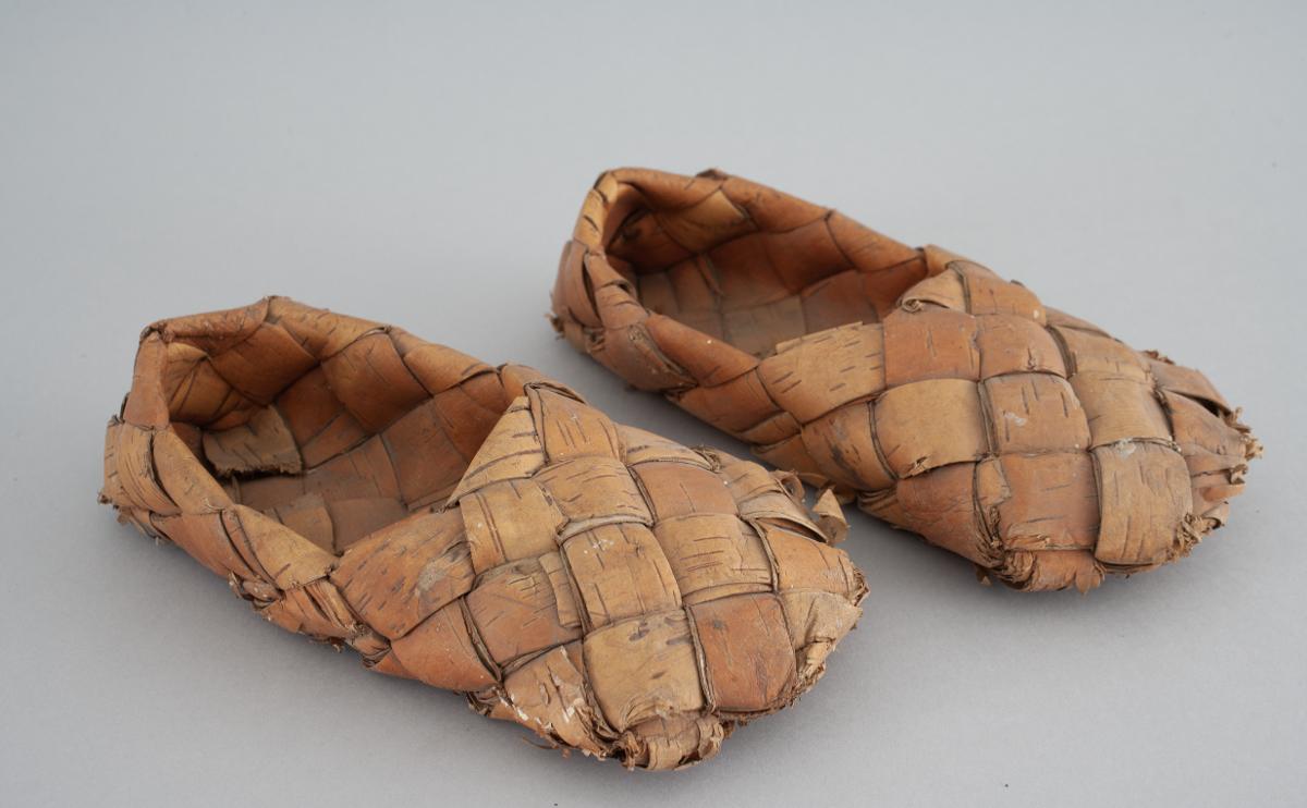 Skor av flätad näver, s k milskor.