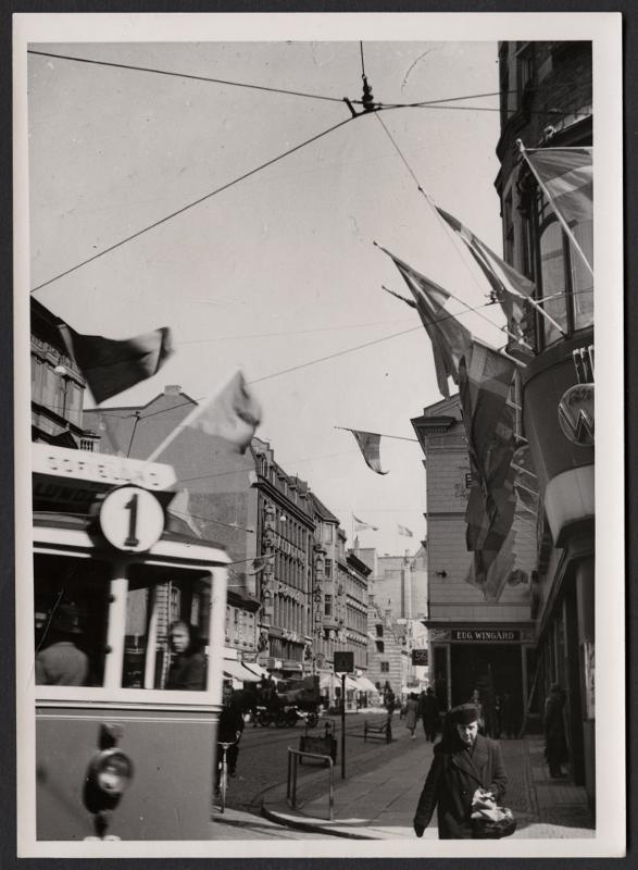 Södergatan vid Stora Nygatan, spårvagn, flaggor