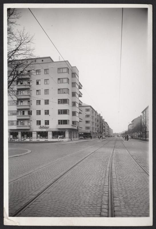 Korsningen Regementsgatan/Mariedalsvägen. Gatubild,spårvägsspår.