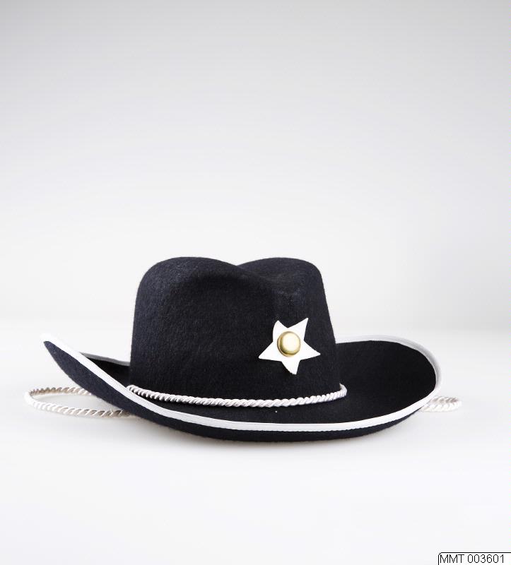 Cowboyhatt av svart filt. Hatt med brätte och kulle vitt nylonband