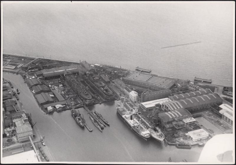 Varvsbassäng+torrdocka,flera båtbyggen,en u-båt. Flygbild.
