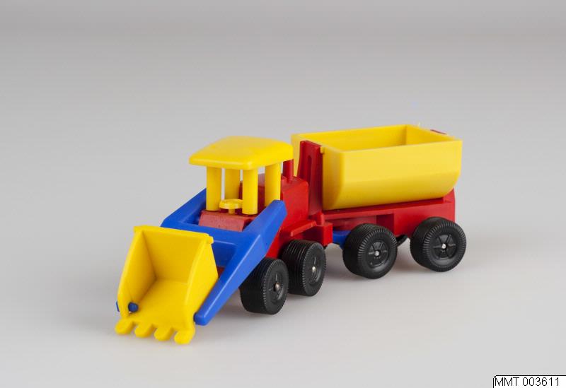 Bil, polykrom, plast, formpressad. Bulldozer med lastvagn, röd bil med