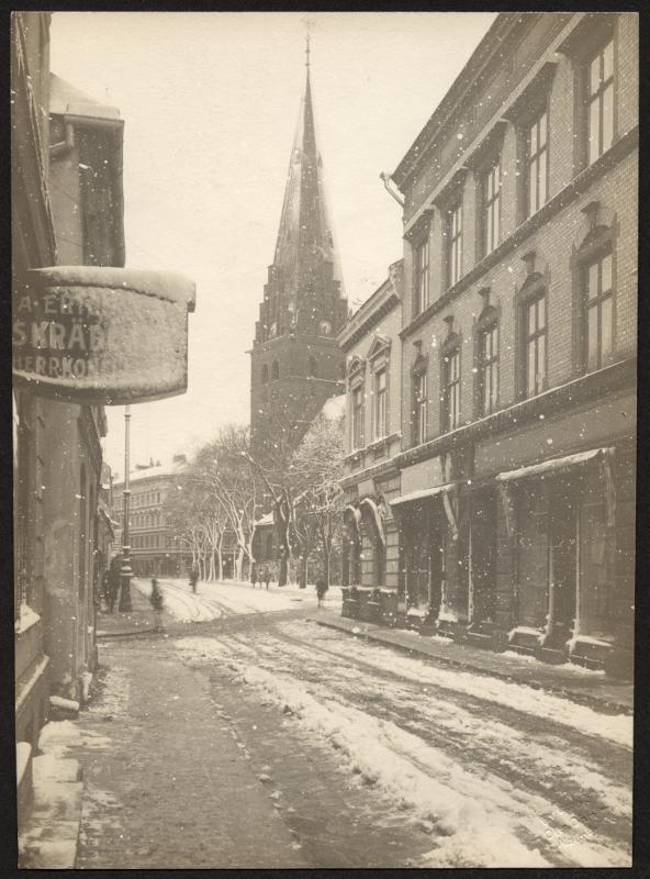 S:t Petri kyrka, exteriör, från Rundelsgatan. Vinterbild.