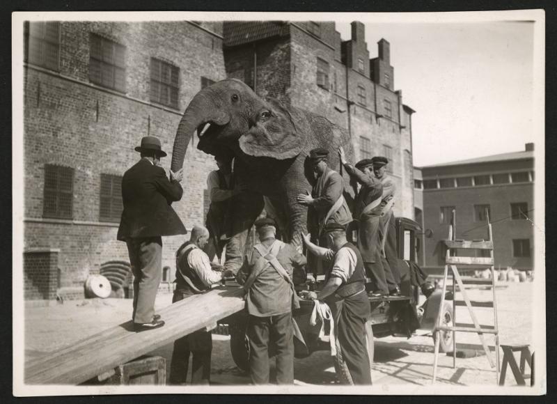 Flyttning av elefanten till nya Malmöhusmuseet. Malmö museum flyttar 5/9/1936.