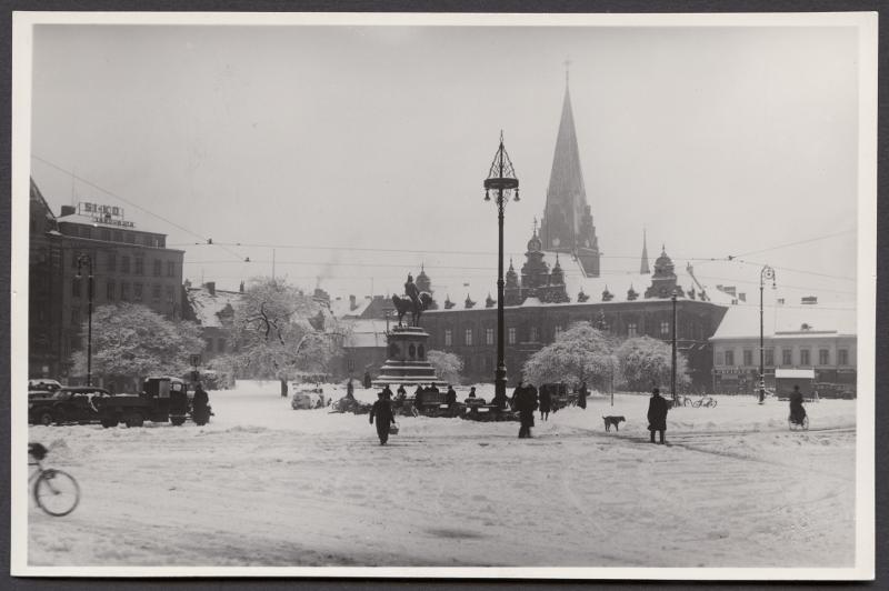 Stortorget, statyn, Rådhuset, torghandel. Vinter i staden