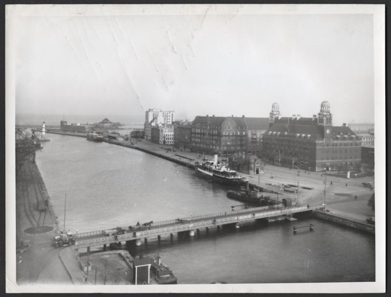 - Vy över Inre hamnen, Skeppsbron och Järnvägsbron (föregångare till Suellsbron).