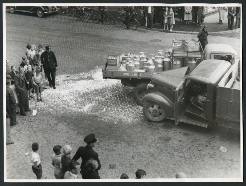 Kollision mellan mjölkbil och lastbil på Södra Förstadsgatan. Gatubild.