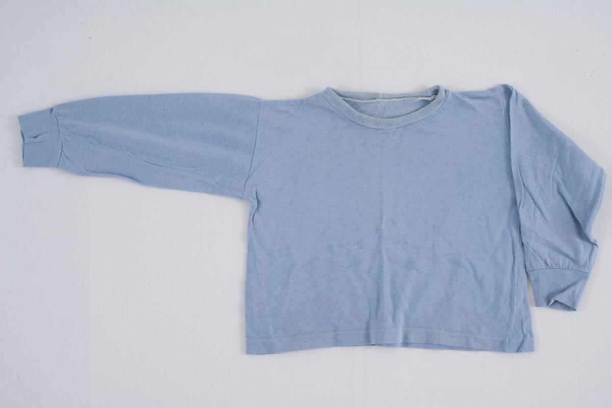 Pyjamaströja av ljusblå silkespläterad bomullstrikå. Lång ärm som avslutas med en mudd, rund halsringning.