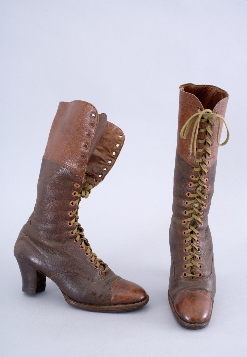 Snörkängor med tåparti och överdelen av skaftet i ljusbrunt skinn. Övrig del av kängan i brunt skinn. Brun hög rak läderklack. Sula med gummi. Foder av brunt skinn och lila bomullstyg. Påsydd etikett i skaftet :