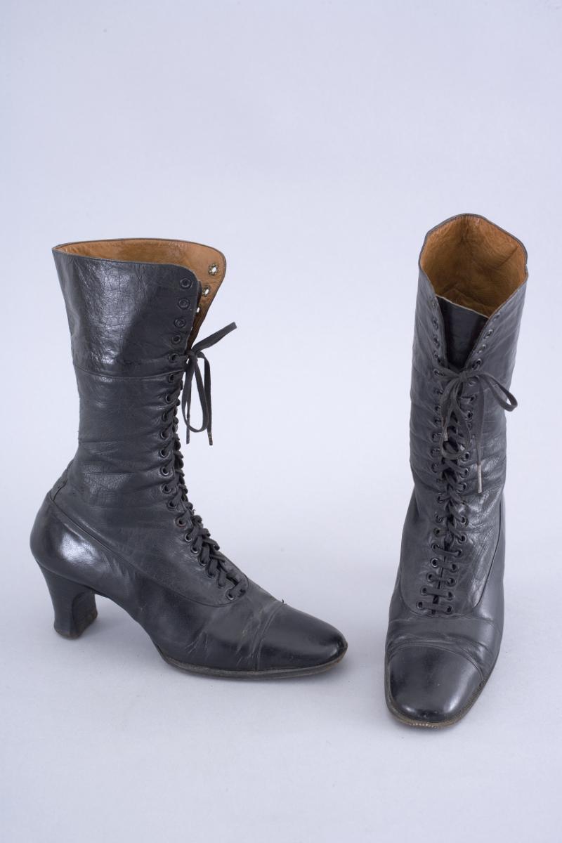 - Svarta snörkängor med ovanläder av svart lackskinn med skaft till hälften av mörkgrå chevreaux och till hälften av svart lackskinn. 20 par snörhål. Foder av brunt skinn och vitt bomullstyg. Randsydd lädersula. Tryckt märke i fodret " P. Dahlberg Krisianstad"