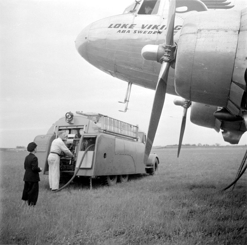 Flygmekaniker i färd att tanka flygplanet DC-3 "Loke Viking".