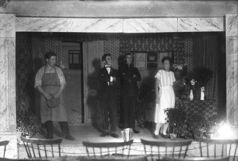 Amatörteater. "Lilla sångfågeln." Två par på scenen.