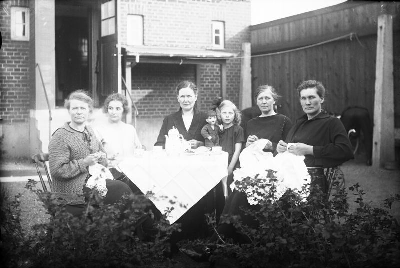 Sällskap vid bord utomhus. Kvinnor med stickning och flicka med docka. Lövkvist