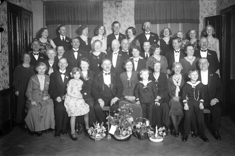 Gruppbild. Släkt. Blomstergåvor. Lövkvist.