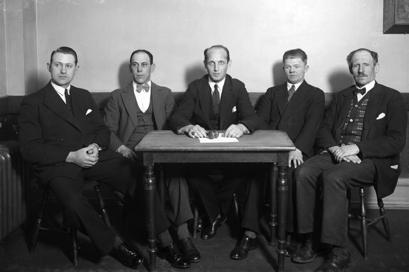 Styrelsemöte. Gruv och fabriks avd 3 och 2. Fem män vid ett bord.