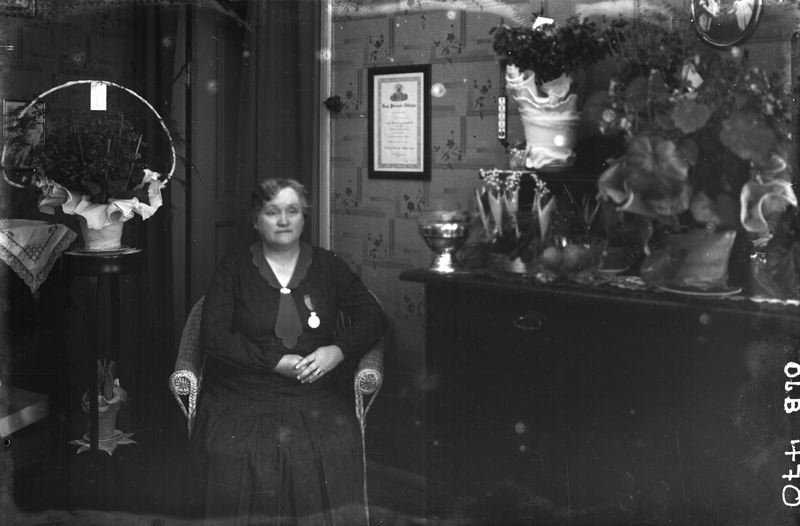Kvinna med blomstergåvor. Svensson.