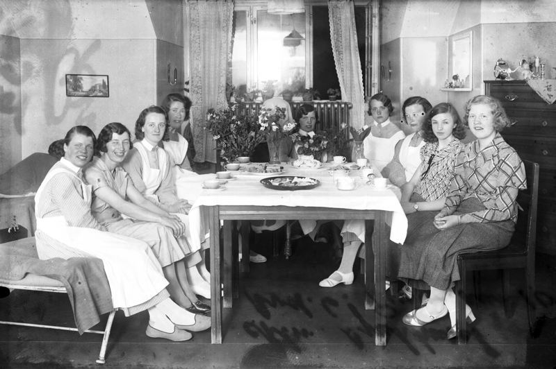 Malmö. Allmänna Sjukhuset avd 6. Personalrum 10. Sjuksköterskor vid dukat bord