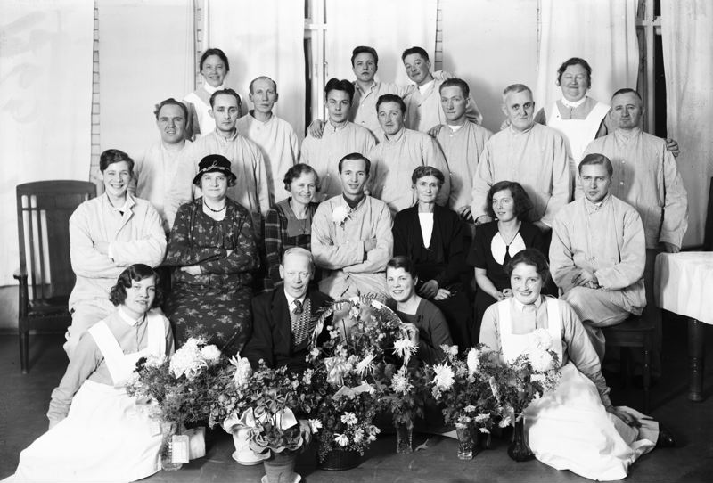 Malmö. Allmänna Sjukhuset avd 6. Patienter, sjuksköterskor och blommor. Svea Rasmusson.