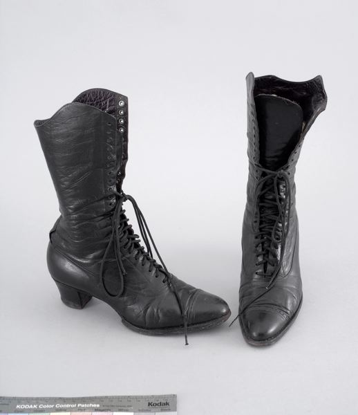 - Snörkängor av svart skinn, lädersulor och läderklack. Foder av svrat skinn och vitt bomullstyg. Olika vänster och högerskor, halvsulade, slitna halvhöga s.k. militärklackar av läder. Avskuren tyåhätta, skaft upp över halva vaden, nersvängda bakåt- Snörhål fram, lång plös.