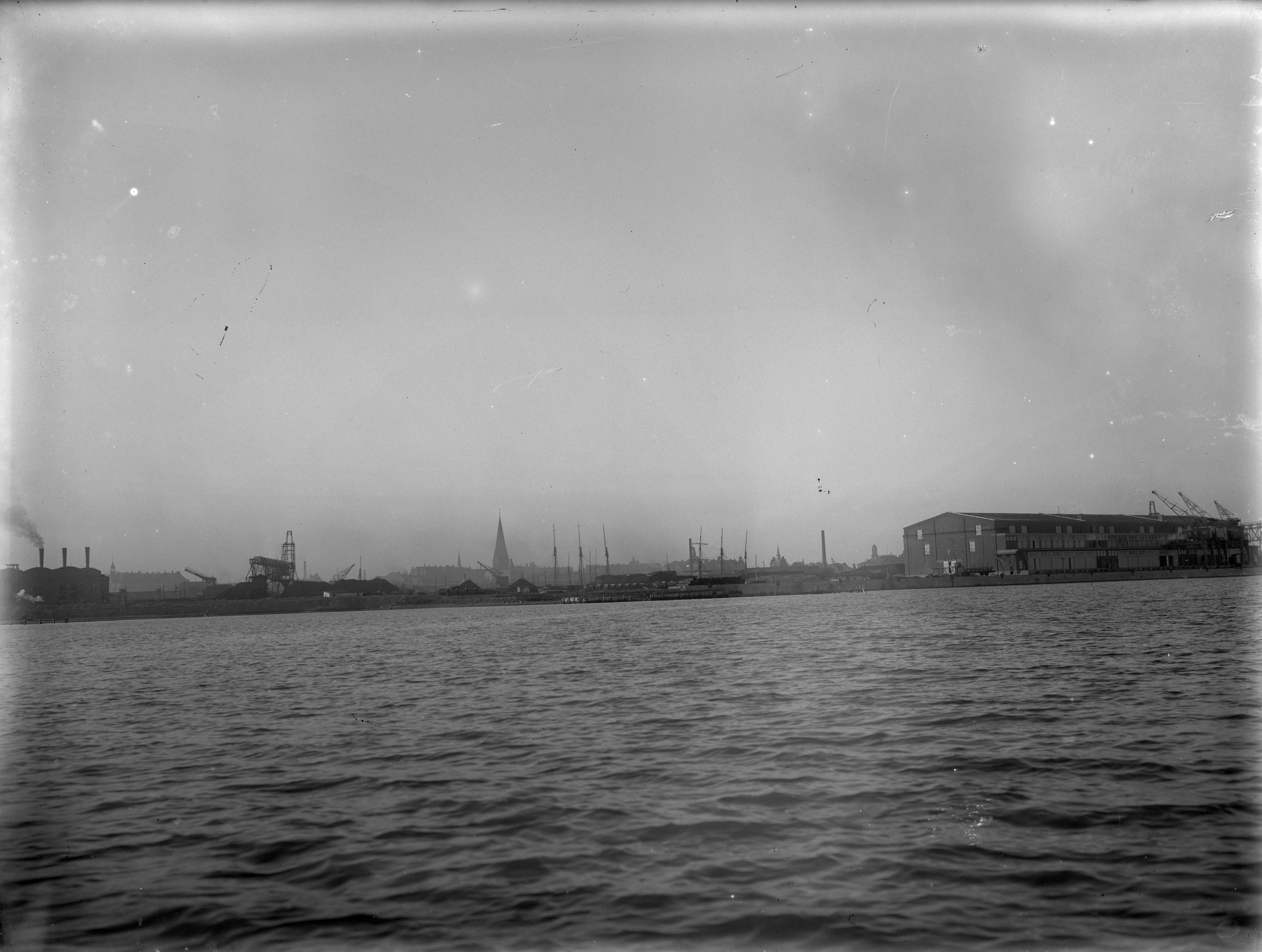 Magasin M1 i Frihamnen till höger, skorstenarna till vänster är Sydkrafts ångcentral (senare Nyhamnsverket).
