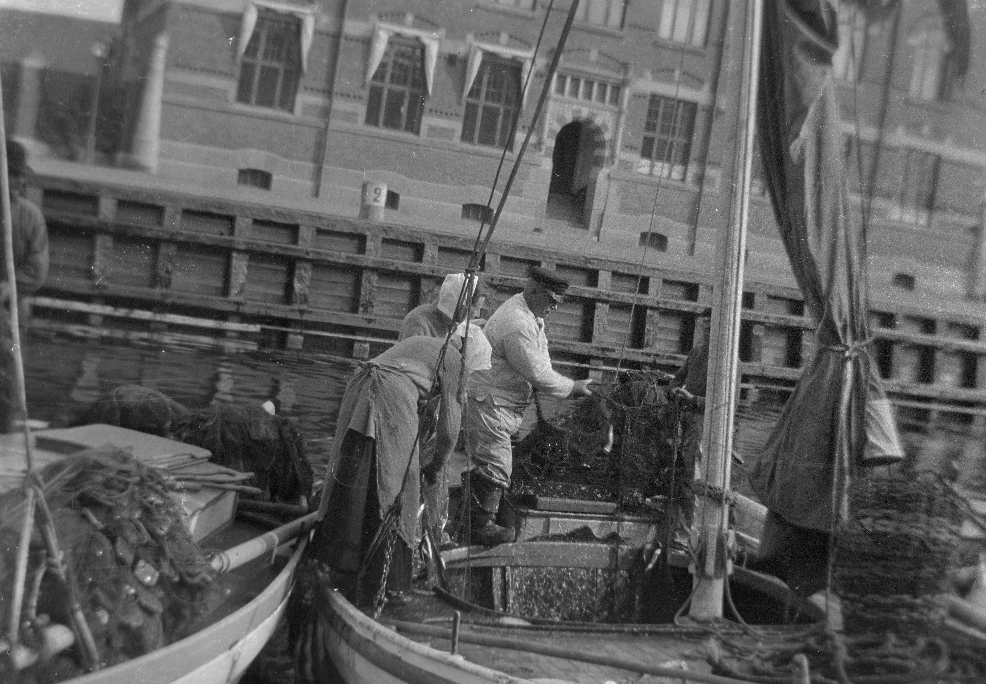 Fiskebåtar i hamnkanal, fiskare i arbete.