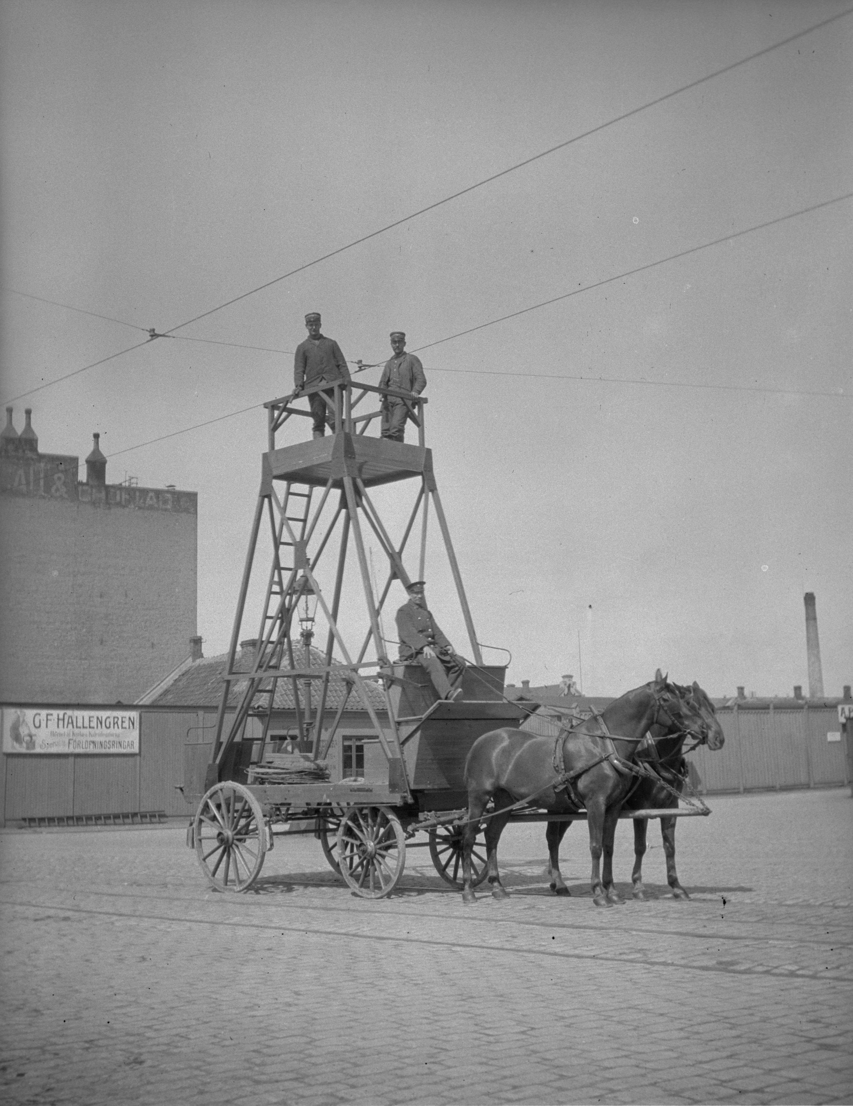 Hästdragen reparationsvagn för elledningar för spårvagnar.