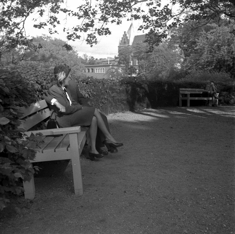 Kvinna på parkbänken i Slottsparken, gamla bibliotek i bakgrunden.