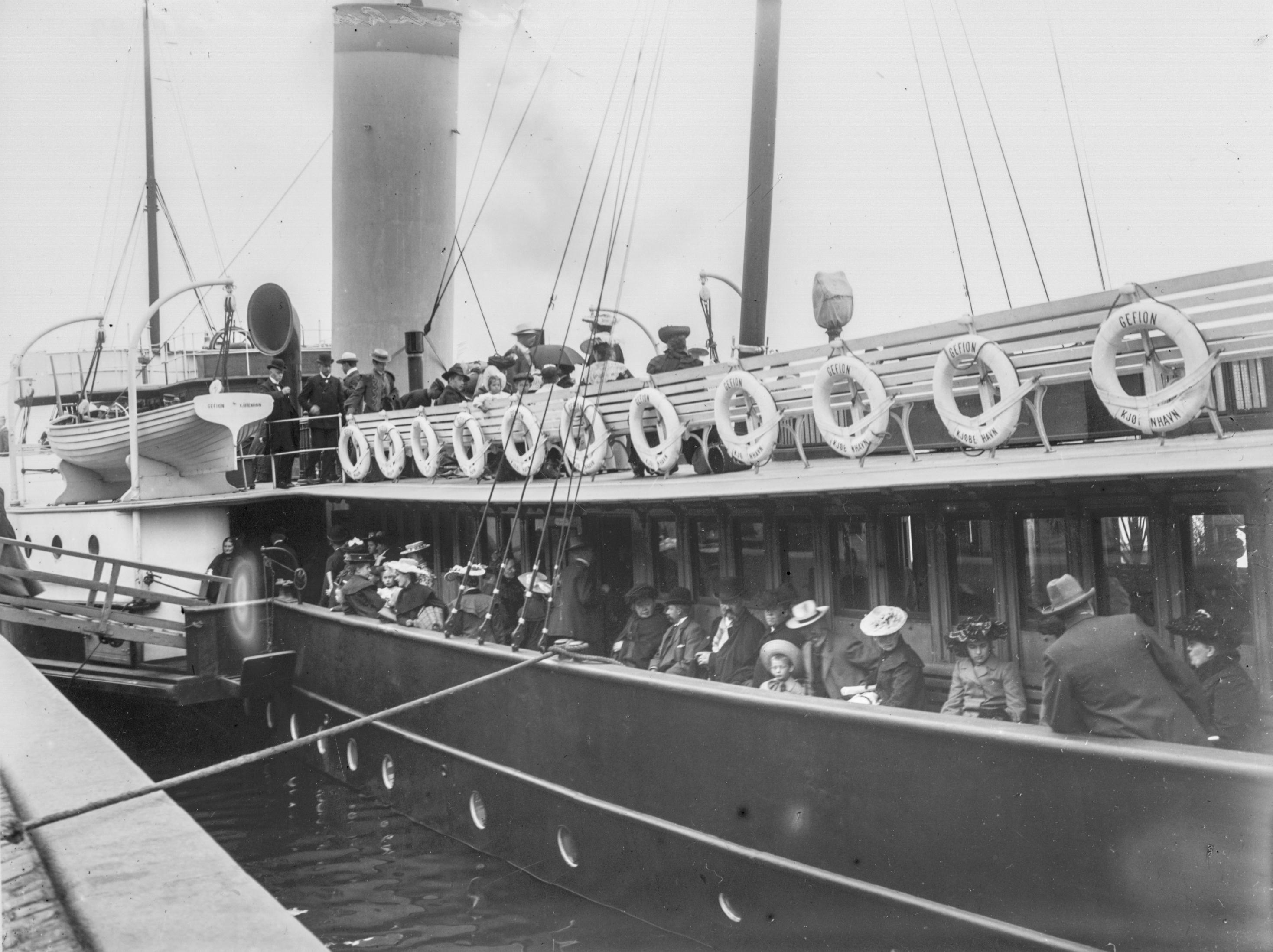 Hjulångaren M/S Gefion, som trafikerade sträckan Malmö-Köpenhamn, vid kaj. Båten kom i trafik 1874. Passagerare på däck.