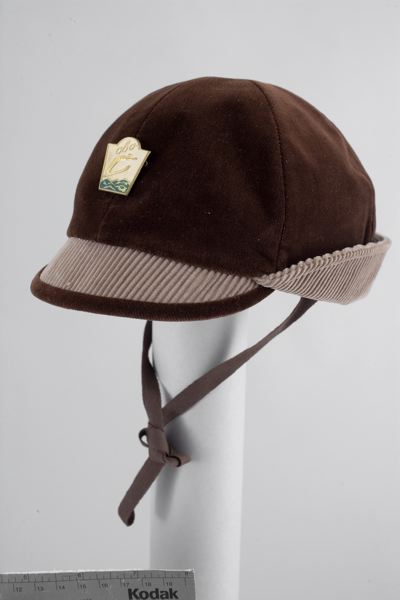 uppvikt bakbrätte av sandfärgad manchester. Skärmens framkant och undersida av brun sammet. Kullen av sex kilar. Foder av brun flanell. Hakband av brunt bomullsband. Metallmärke framtill med texten obo och bilden av en skidhoppare. Vidhängande prislapp med texten obo. Storlek 50. Fabriksny.