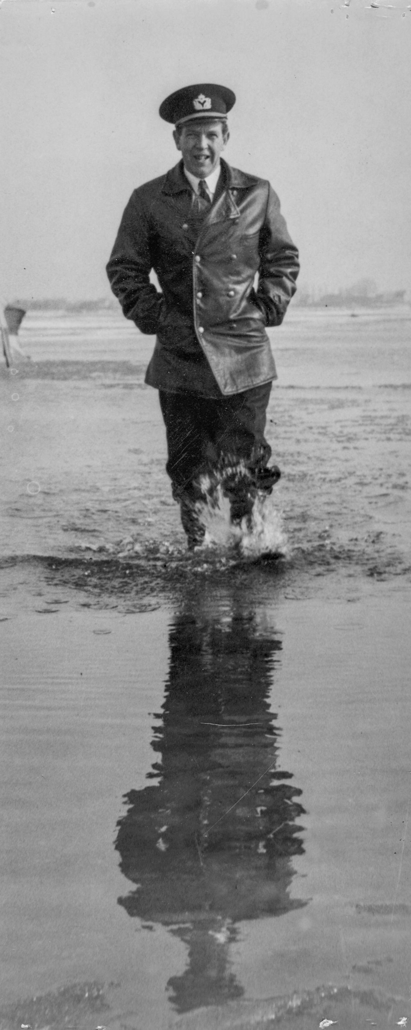 "Flygplatschefen major B. Bergman står upp till knäna i vattnet".