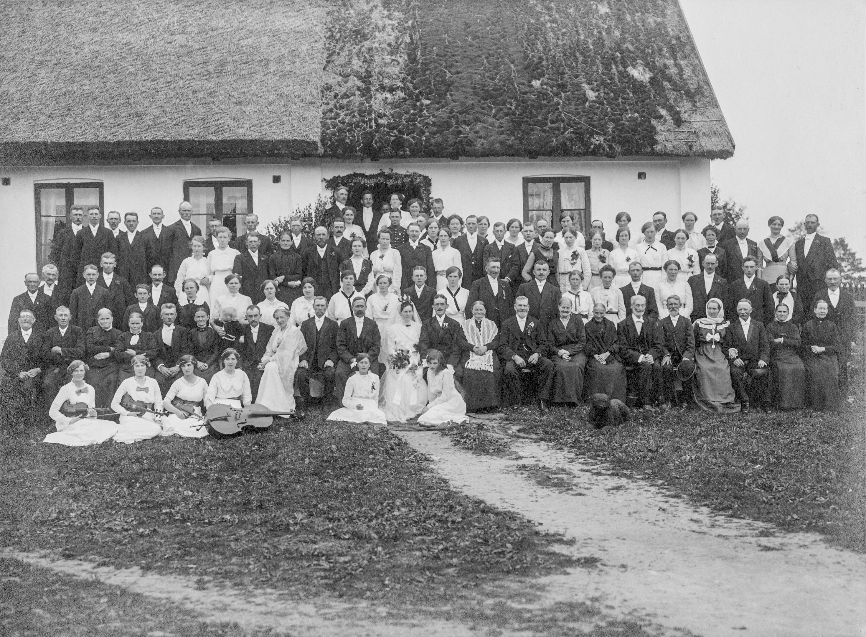 OPK 000619 :: bröllopsporträtt, bröllop, exteriör, halmtak, gruppbild, gruppbilder, exteriörer