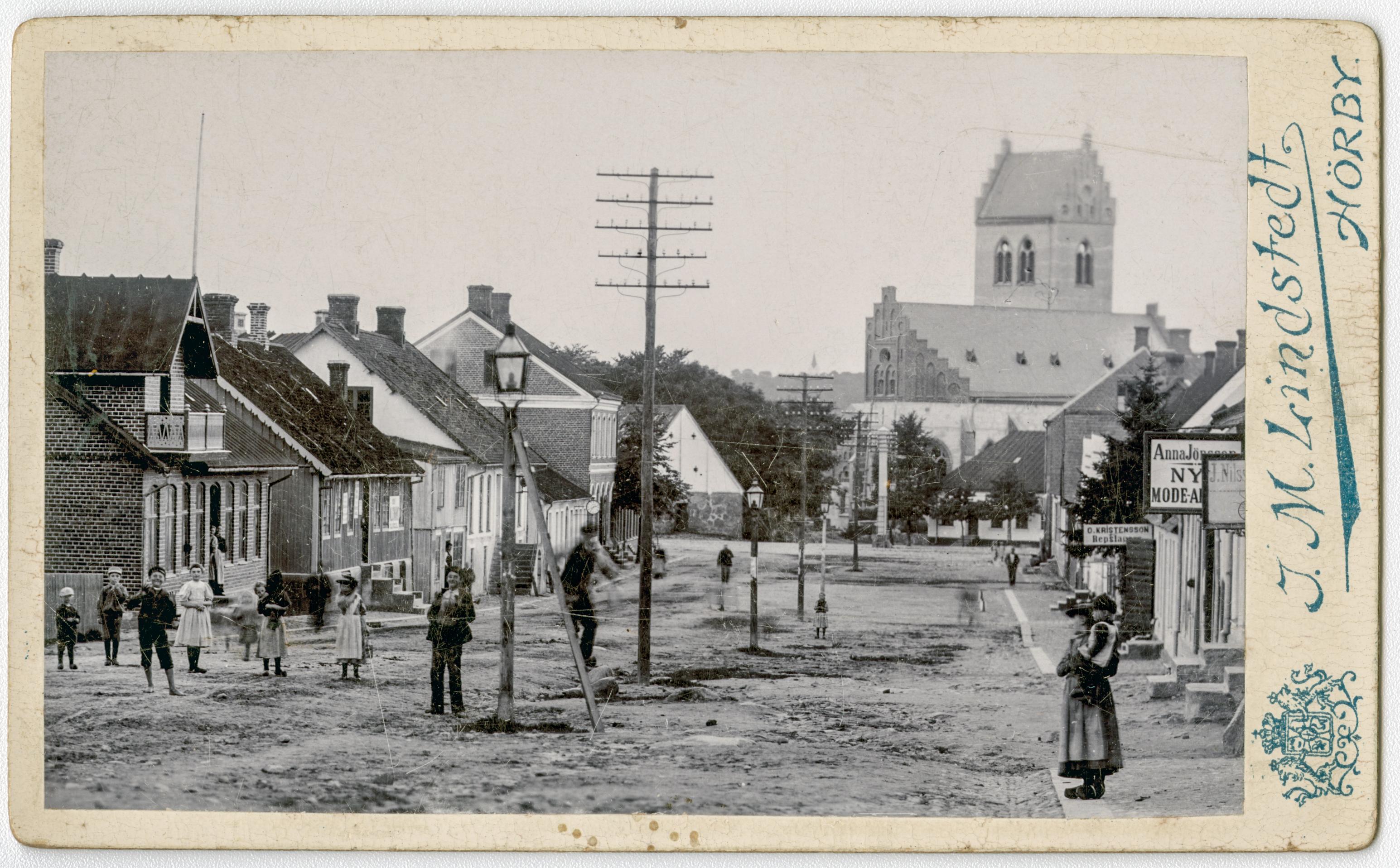 Bygata, människor, kyrka (Hörby ?).