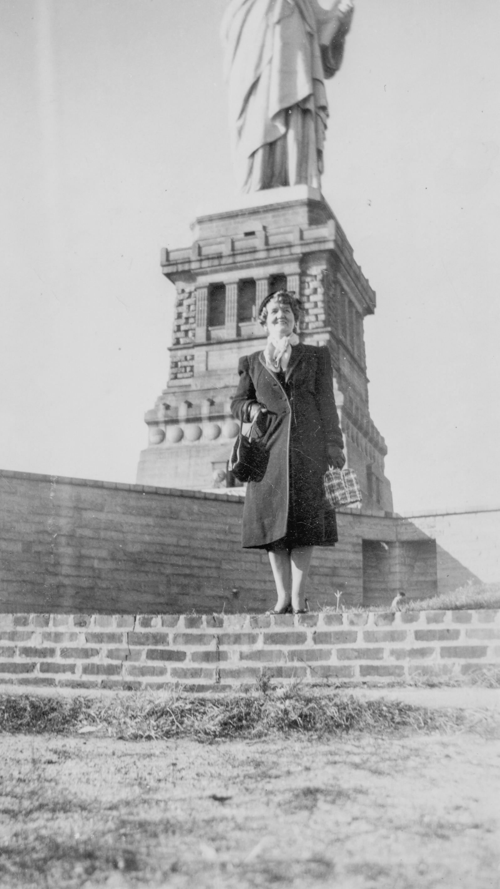 Kvinna (Agda) framför Frihetsgudinnan på Liberty Island i New York.
