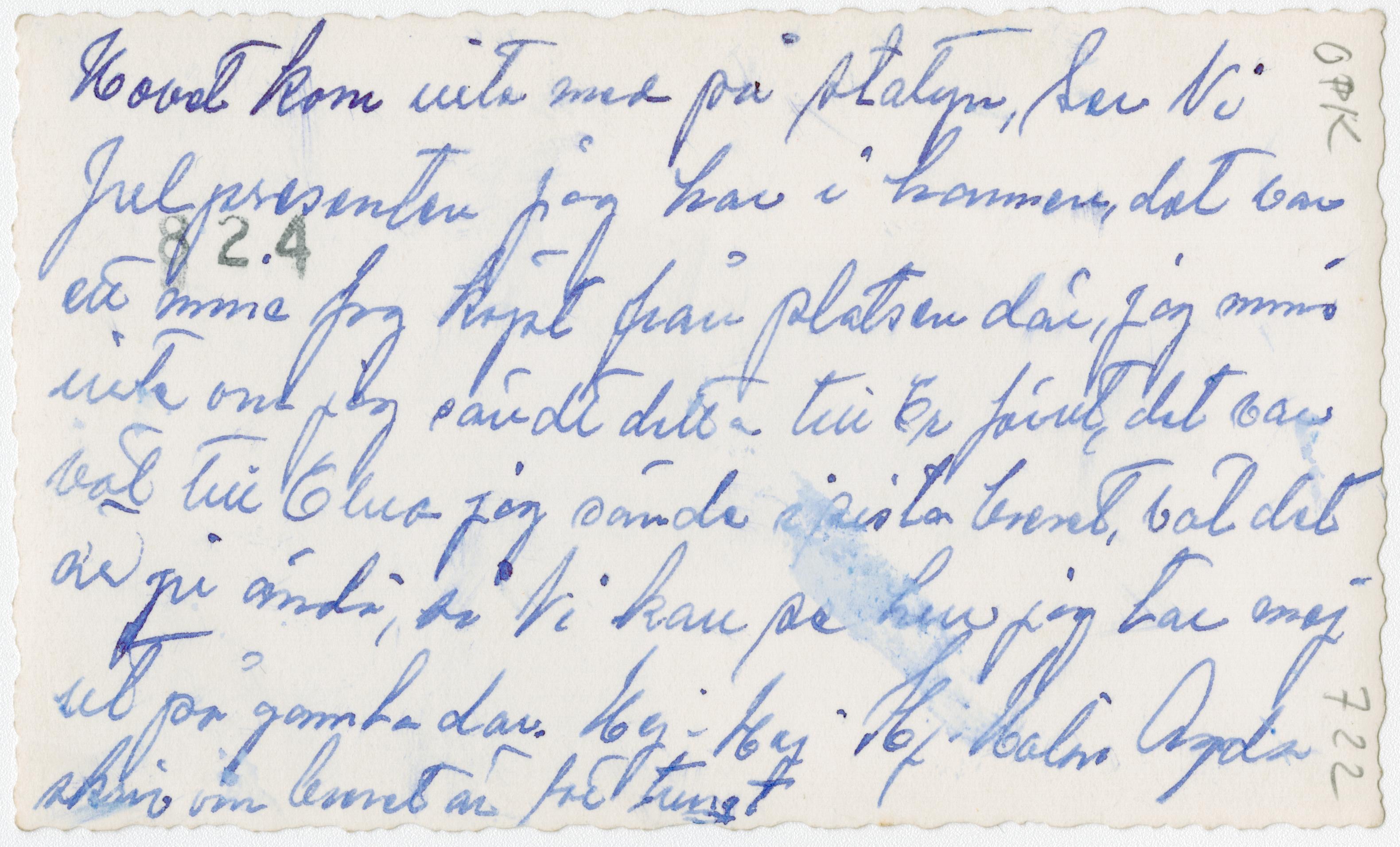 Påskriften lyder: "Hovet kom inte med på statyn. Ser ni julpresenten jag har i handen(?), det var ett minne jag köpte på platsen där, jag minns inte om jag sände detta till Er förut, det väl till Elna(?) jag sände sista brevet, xxx xxx är ju ändå, så Ni kan se hur jag tar mej ut på gamla dar. Hej-Hej Xxxx Agda skriv om brevet är för tungt".