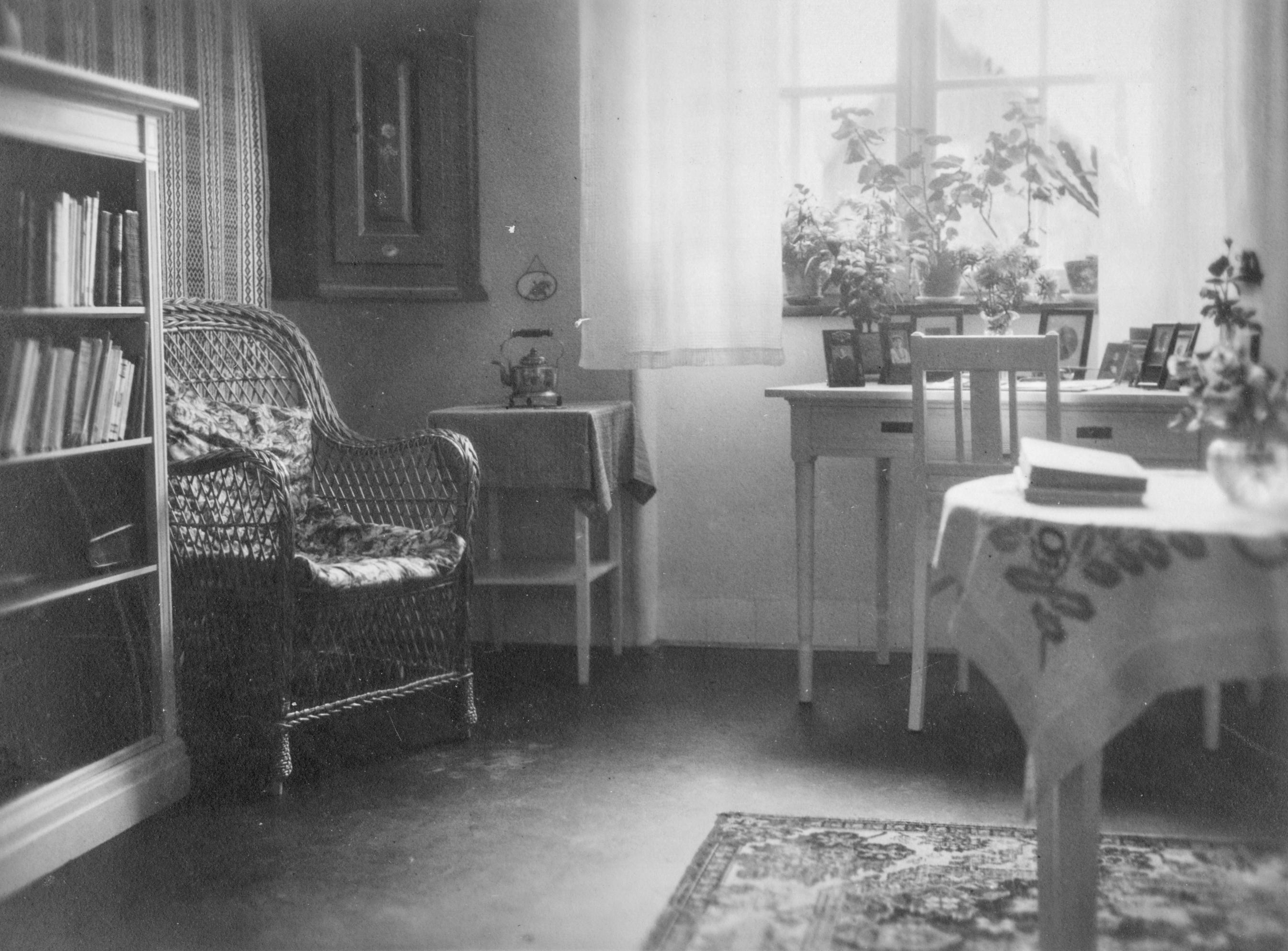 OPK 000729 :: interiör, rumsinteriör, korgstol, bokhylla, rumsinteriörer, korgstolar, bokhyllor