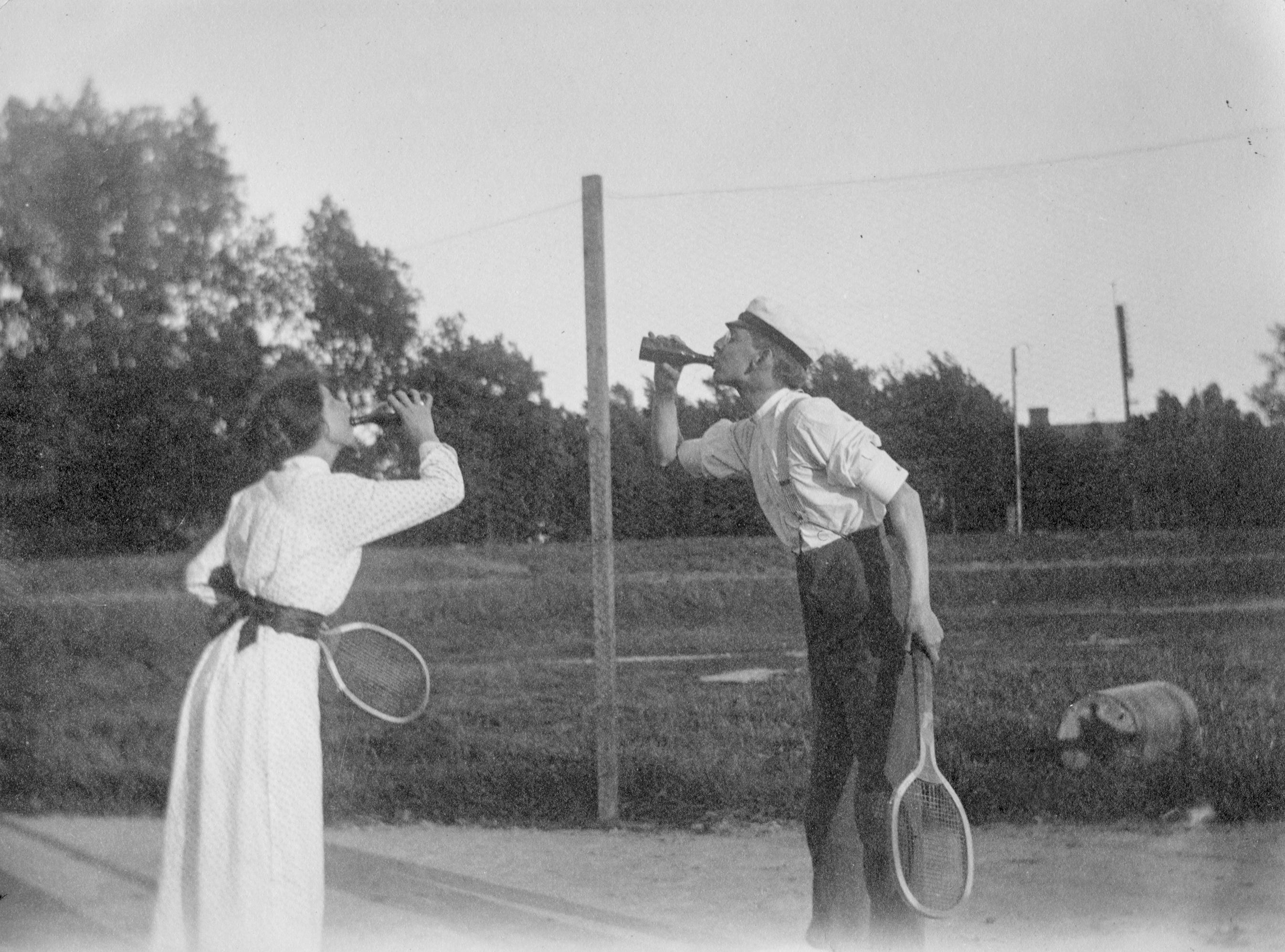 - Man och kvinna, tennisspelare dricker ur flaskor. I bakgrunden till höger ligger en handdragen vält som sannolikt har använts för att jämna till tennisbanan.