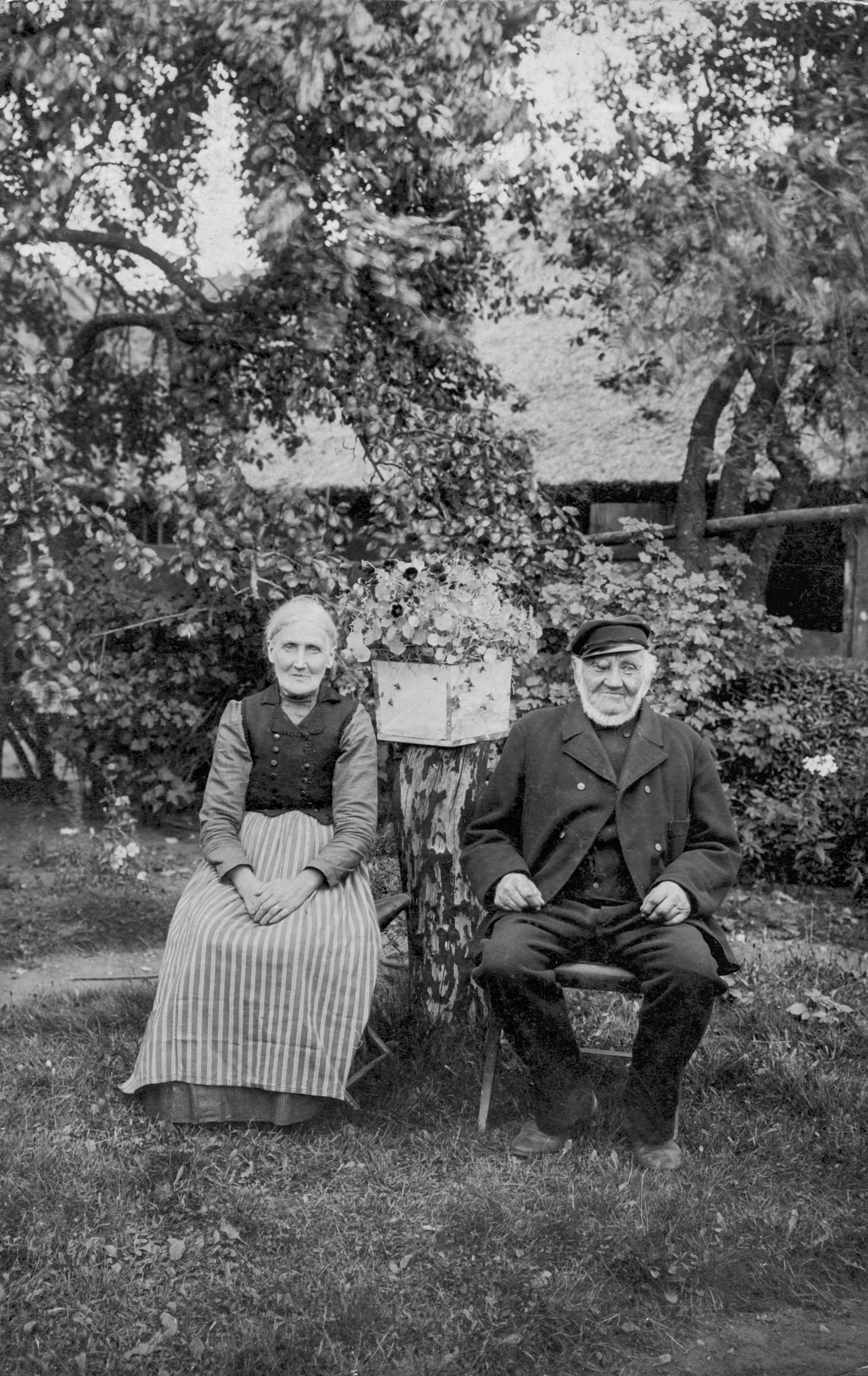 Ett äldre par, en kvinna och en man, sittande i en trädgård framför ett hus. Skättilljunga.