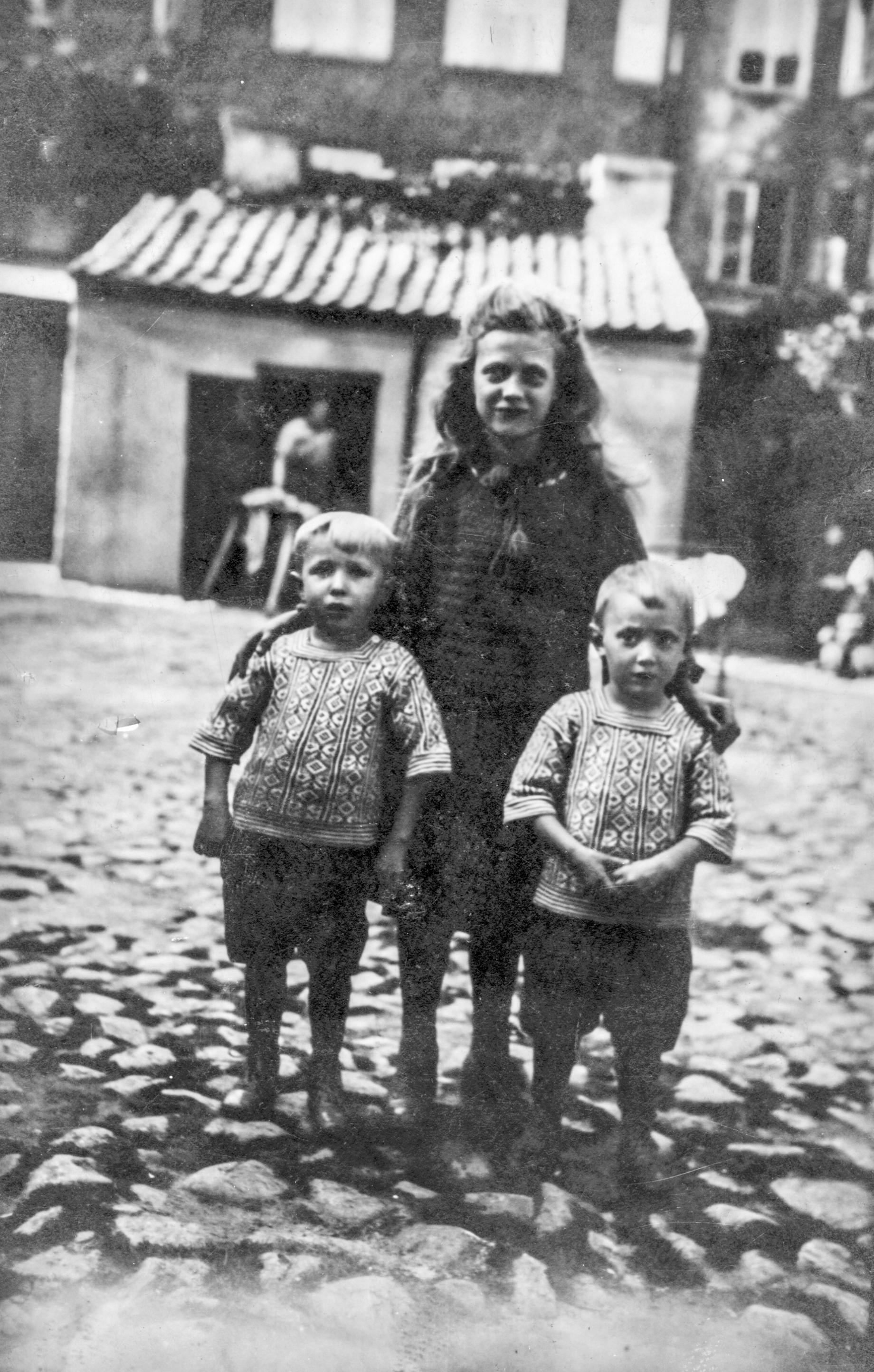 OPK 000810 :: kvinna, pojke, gårdsinteriör, pojkar, flicka, bakgård, bakgårdar, flickor
