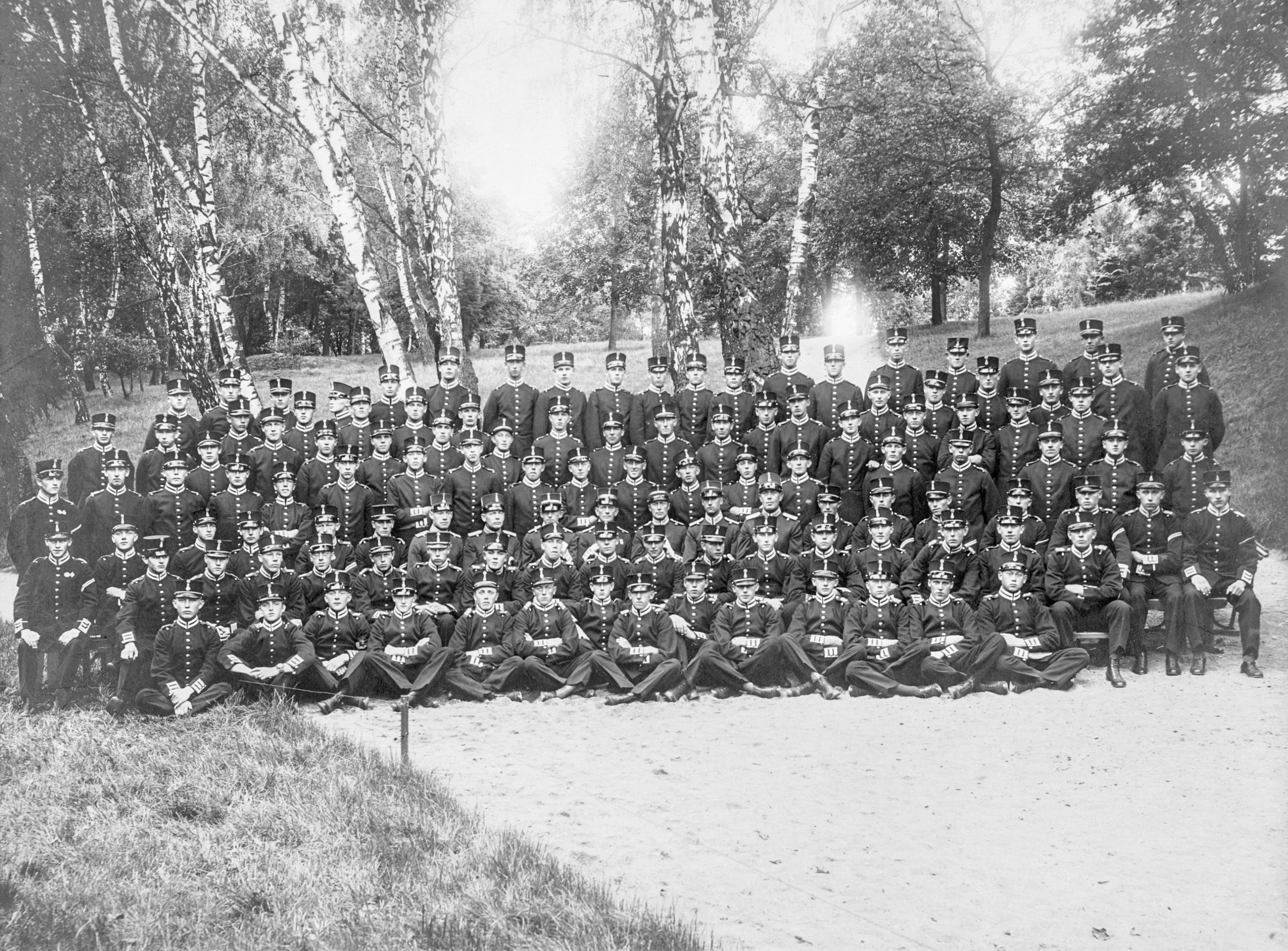 Gruppbild - soldater i parken. Manskap vid Svea eller Göta Livgarde i uniform m/1886 med mössa m/1865-99.