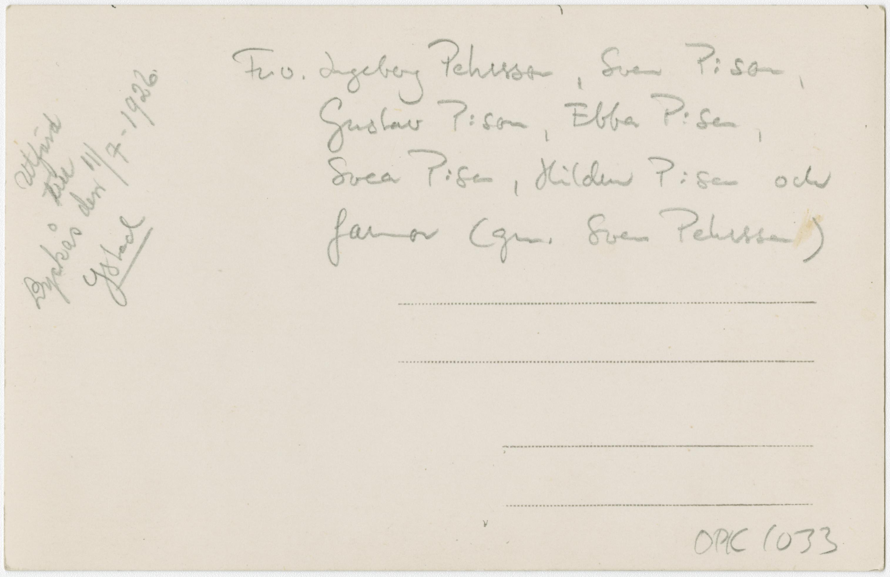 Påskriften lyder: "frv. Ingeborg Pehrsson, Sven P:son, Gustav P:son, Ebba P:son, Svea P:son, Hildur P:son och farmor (gm. Sven Pehrsson). Utfärd till Lyckås den 11/7 - 1926 Ystad".