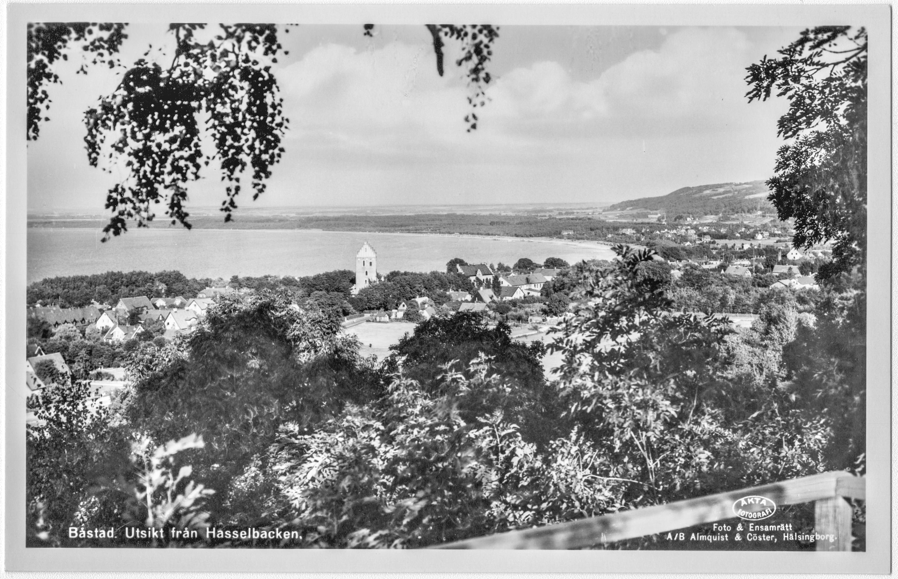 Båstad - utsikt norrut från Hasselbacken. (vykort). Laholmsbukten i bakgrunden.