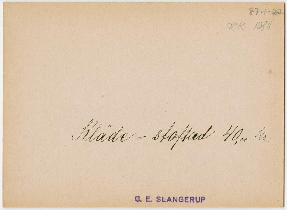 Påskriften på baksidan lyder: "Kläde - stoftad 40,00 Kr.".